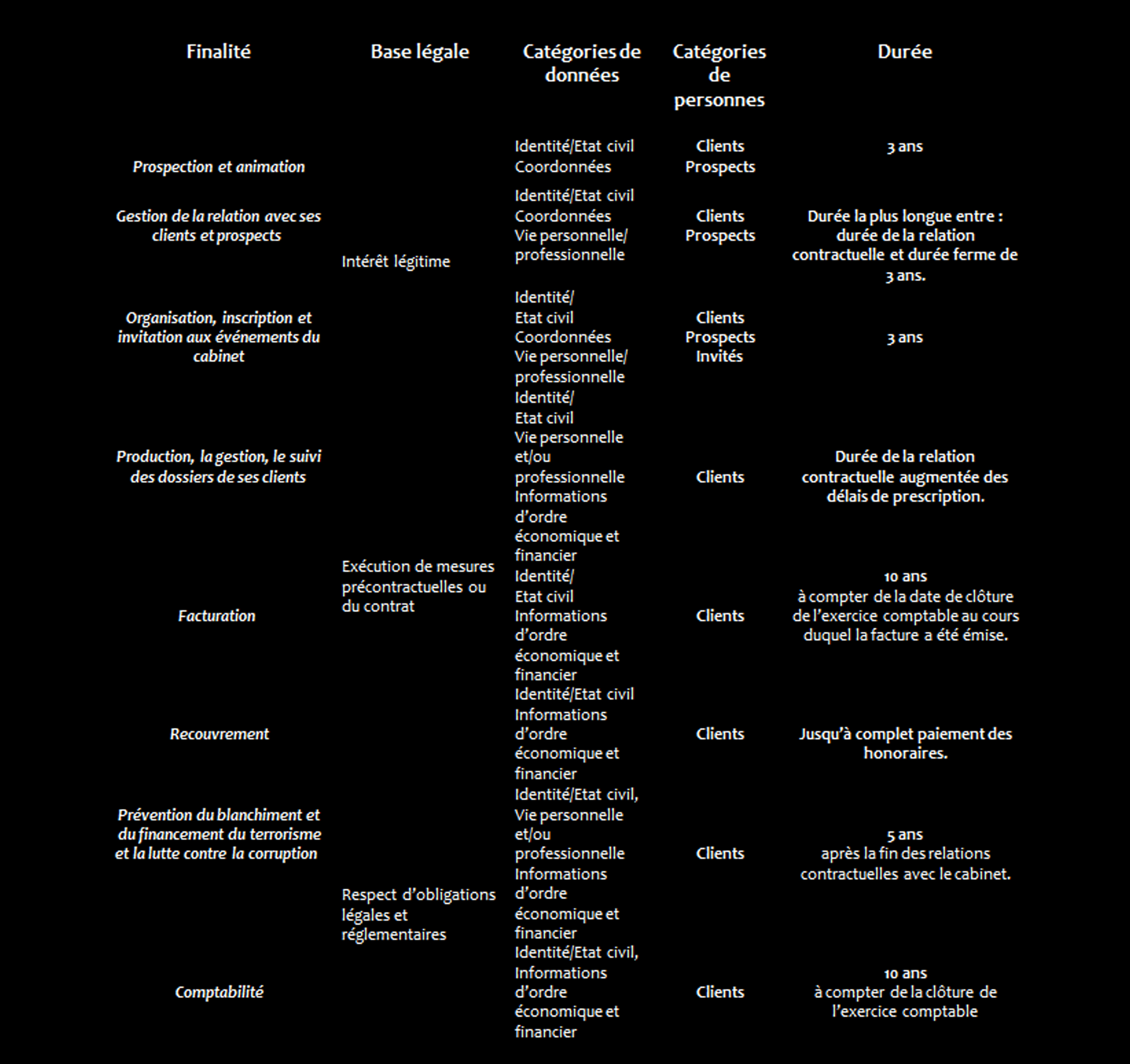 Traitement mis en oeuvre – Le cabinet met en oeuvre des traitements de données à caractère personnel concernant ses clients. Ces traitements présentent les caractéristiques suivantes :